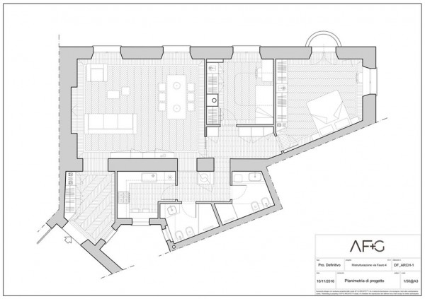 Qualità ed amplificazione dello spazio e degli elementi caratteristici della preesistenza sono stati resi possibili concependo la spina centrale come un vero e proprio setto architettonico che tagli in due l'appartamento ed enfatizza l'impatto prospettico perdendosi oltre il nuovo divisorio-boiserie della zona pranzo caratterizzato dall'ultima anta a scomparsa che immette direttamente nel disimpegno della zona notte.