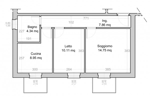 La configurazione vedeva la presenza di soggiorno, camera singola e cucinotto con il bagno ricavato in una porzione dello stesso, al termine del corridoio distributivo, parallelo all'altra unità immobiliare confinante.