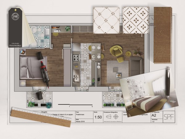 Il mood classico delle vecchie marmette di recupero è stato trasformato in un concetto decorativo contemporaneo, andando a costituire oltre che isole di pavimentazione (area cucina, bagno, balconcini, soglie) anche elementi caratterizzanti ad esempio la zona notte, ove il richiamo è stato rielaborato nella testiera del letto divenendo punto focale della stanza, come interpretazione di un arazzo contemporaneo, intonato con la nuance dell'involucro architettonico e degli arredi.